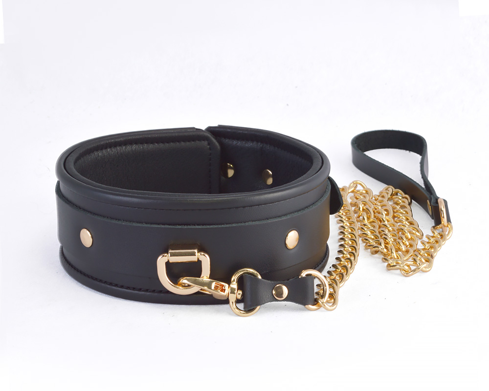 Ошейник шириной 55 мм имеет декоративный элемент в виде накладки из кожи с хольнитенами золотого цвета и металлическим кольцом, которое используется для присоединения поводка - цепочки к ошейнику. Общая длина поводка около 90 см. Размер изделия регулируется металлической пряжкой.